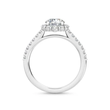 Platifine 950 Platinum 1.69 ct halo engagement ring featuring a 1.00 ct Round Lab Diamond, pave shoulders, EF color VVS clarity, IGI Certified.