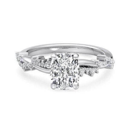 Platifine 1.50 CT Premium Moissanite Elongated Cushion Cut engagement ring in 950 Platinum with prong setting and twisted pave band, GRA Certified.