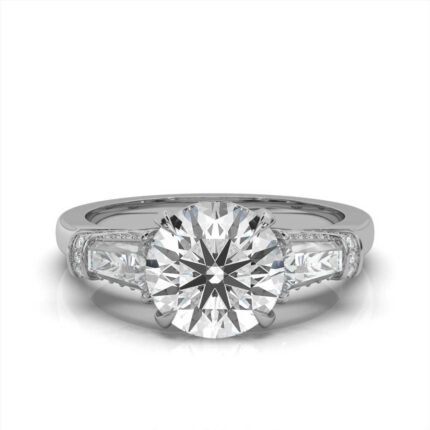 Platifine 950 Platinum engagement ring with a 2.6ct Round Super Cut Natural Diamond, 0.59ct side stones (round & tapered baguette), GIA Certified.