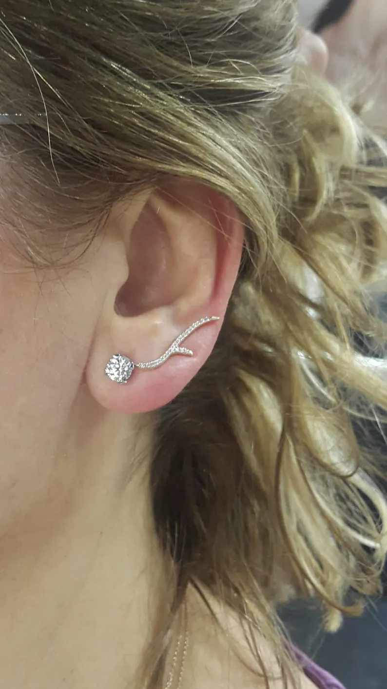 Adorning each earring are 46 round-cut lab diamonds with a total weight of approximately 0.25 carats. Each diamond measures about 1.10 mm, delivering brilliant sparkle in a lightweight and comfortable design. These stones boast an excellent cut, with color EF and clarity VVS, ensuring exceptional radiance and purity, perfectly complementing the premium platinum setting.