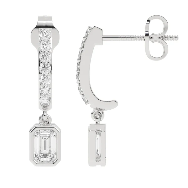 These earrings feature a total of 1.31 carats of lab-grown diamonds, expertly cut in a combination of round and emerald shapes, distributed across sixteen dazzling stones. The lab diamonds are IGI certified with an excellent cut, EF color, and VVS clarity, ensuring a brilliant sparkle that captures the light with every movement. This harmonious blend of shapes enhances the earrings’ sophisticated and dynamic appeal.