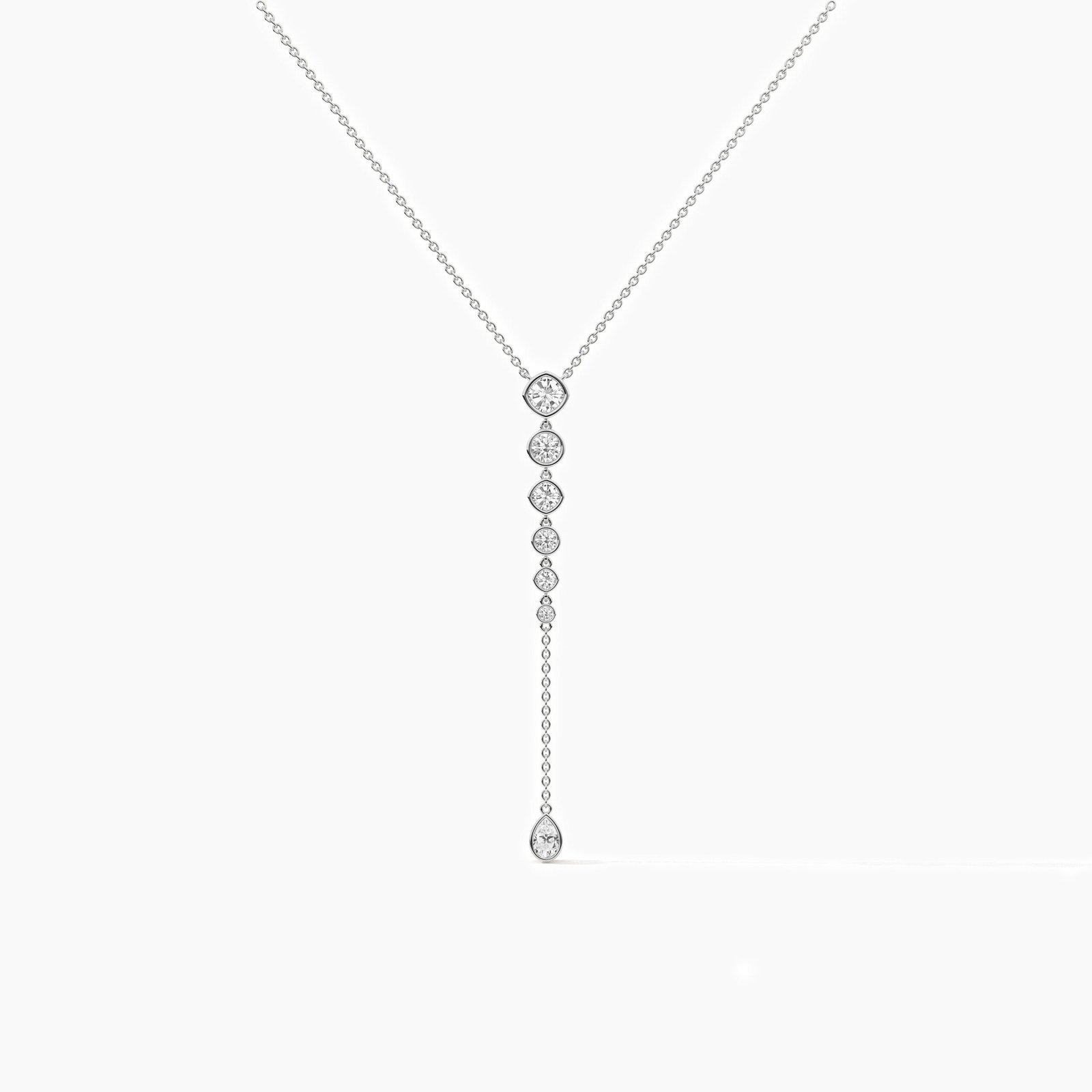 Platifine 950 Platinum lariat necklace with 1.50ct Natural Diamonds — pear, cushion & round cuts, Excellent cut, GH color, SI clarity, GIA Certified elegance.