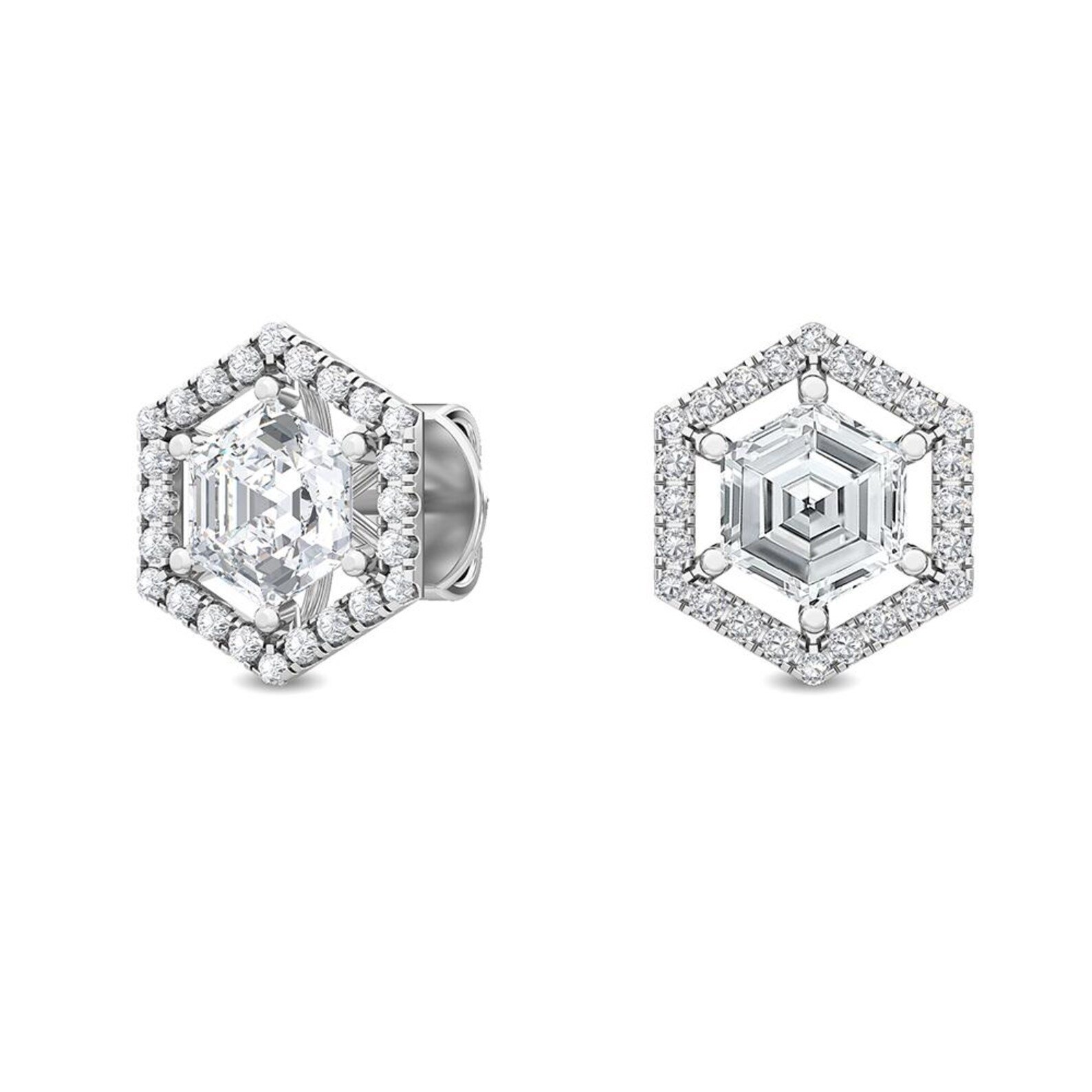 These earrings feature premium moissanite stones, known for their exceptional brilliance and fire. With a total carat weight of 1.68ct, the stones are cut in a unique hexagon shape surrounded by a halo of round brilliant moissanite accents. Each stone showcases an excellent cut, delivering remarkable sparkle that rivals traditional diamonds. Color, clarity, and certification guarantee the highest quality standards, ensuring lasting radiance.