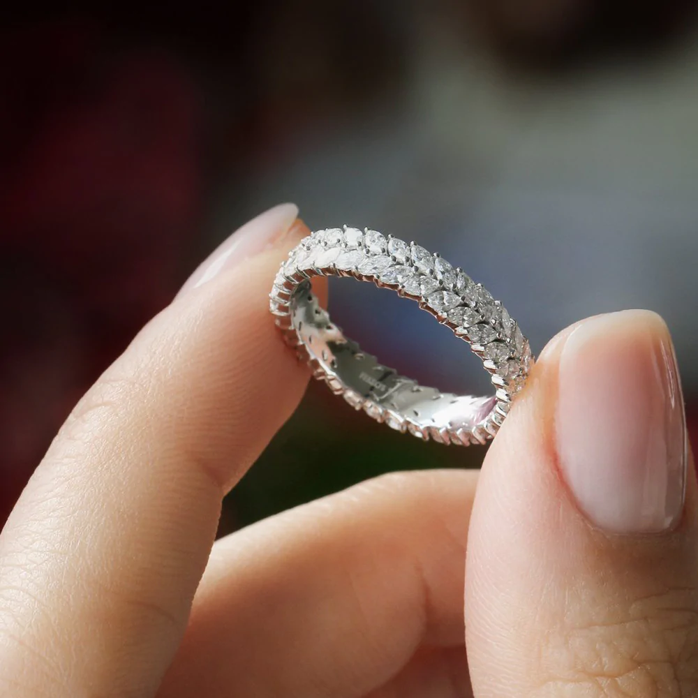 Platifine 950 Platinum 1.82ct Marquise Lab Diamond prong anniversary ring, 64 marquise stones, EF color VVS clarity, IGI Certified for lasting brilliance.