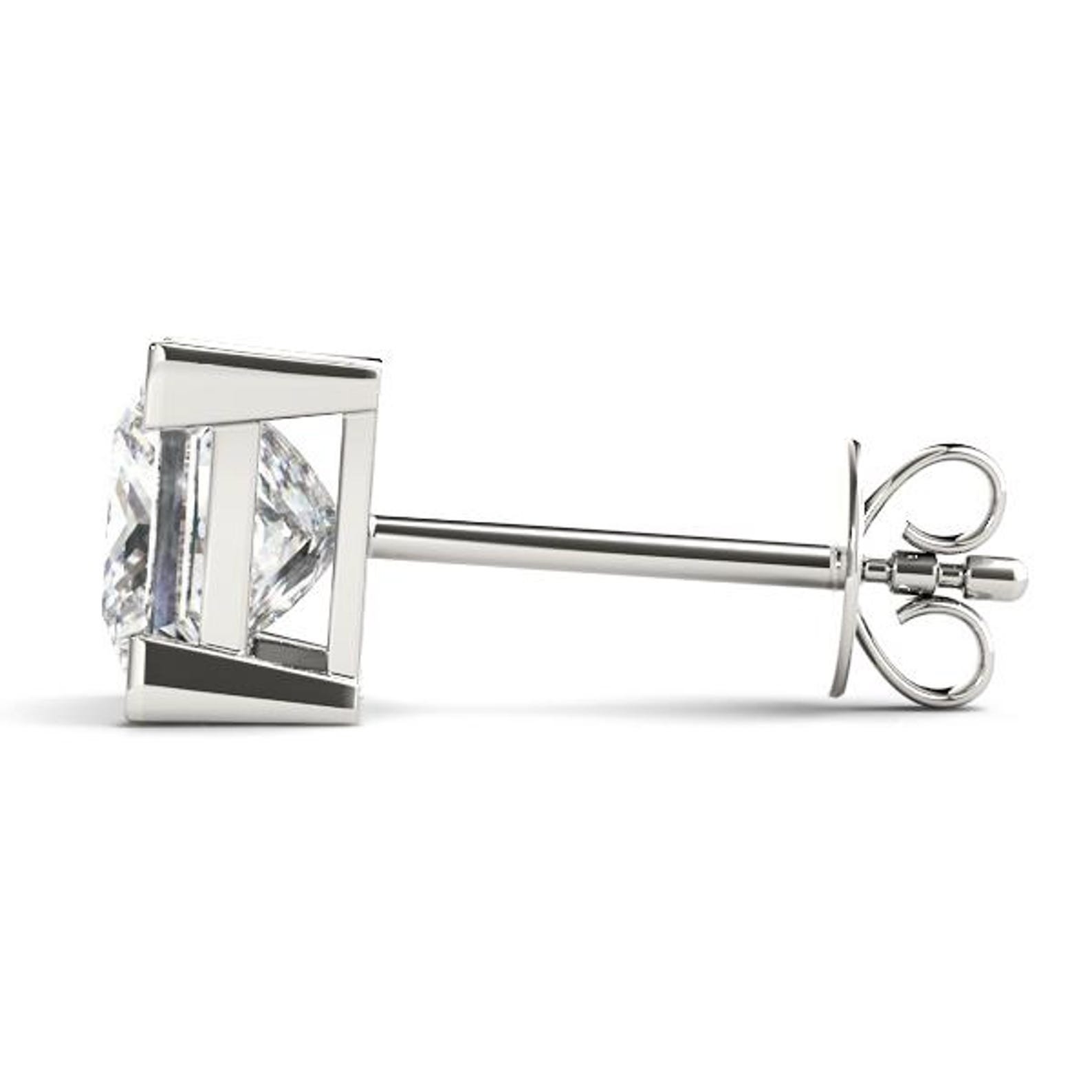 Featuring premium moissanite stones totaling 1 carat, these earrings are adorned with two princess-cut stones, each measuring approximately 0.50 carats. The stones exhibit an excellent cut, D color, and VVS1 clarity, ensuring remarkable sparkle and brilliance that rival traditional diamonds. Certified by GRA, these moissanite stones reflect quality and authenticity.