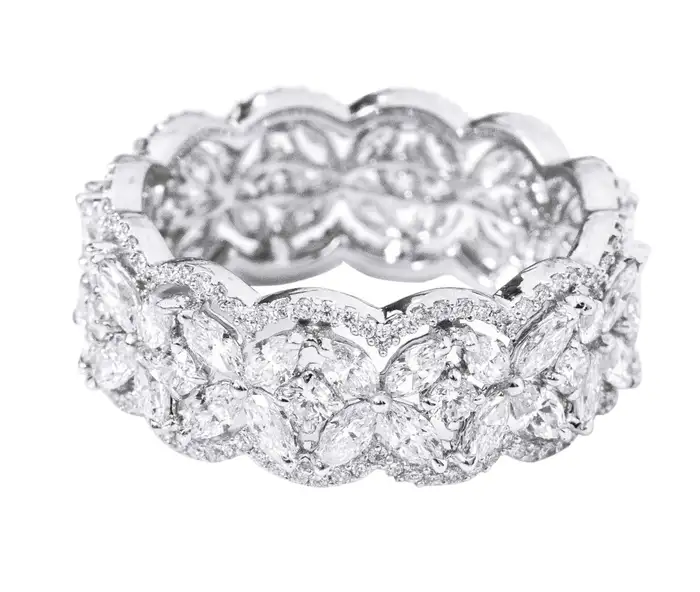 This exquisite ring features an enchanting full band set with natural diamonds totaling 2.46 carats. Each diamond boasts an excellent cut, GH color, and SI clarity, creating a continuous sparkle that radiates brilliance from every angle, embodying the true essence of fine craftsmanship.