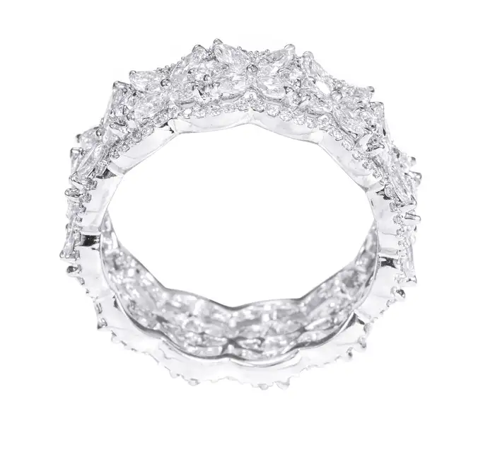 The full-band setting ensures the diamonds encircle the finger in a seamless array, offering a captivating display of light and sophistication. The 950 Platinum construction provides exceptional durability and a beautiful white sheen that complements the diamonds flawlessly.
