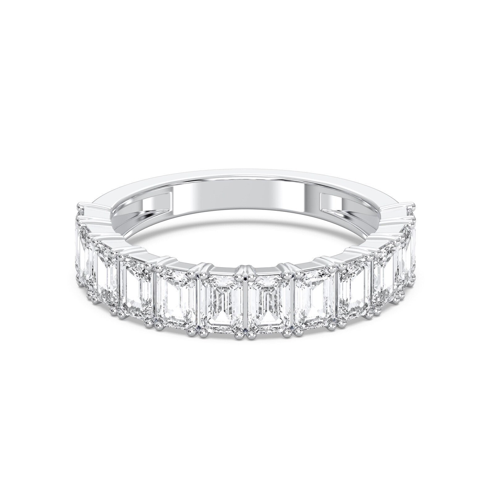 Set in a half-eternity style, the stones are precisely arranged to highlight their mirror-like facets and elegant geometry while maintaining a comfortable fit. The streamlined design of the 950 Platinum band enhances the brilliance of the emerald-cut diamonds, presenting a refined balance of tradition and modernity.