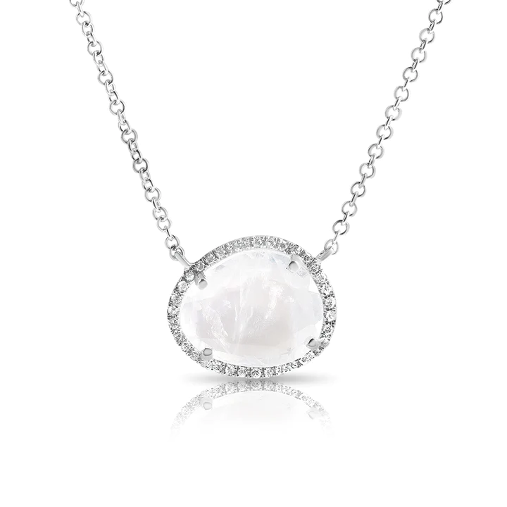 The necklace features a stunning 2.5 carat moonstone that captivates with its enchanting glow. Surrounding the moonstone is a delicate halo of pavé-set diamonds totaling 0.10 carats. The moonstone is a gemstone with excellent cut, certified by a gemstone lab, highlighting its radiant shimmer without overpowering the necklace’s subtle sophistication.