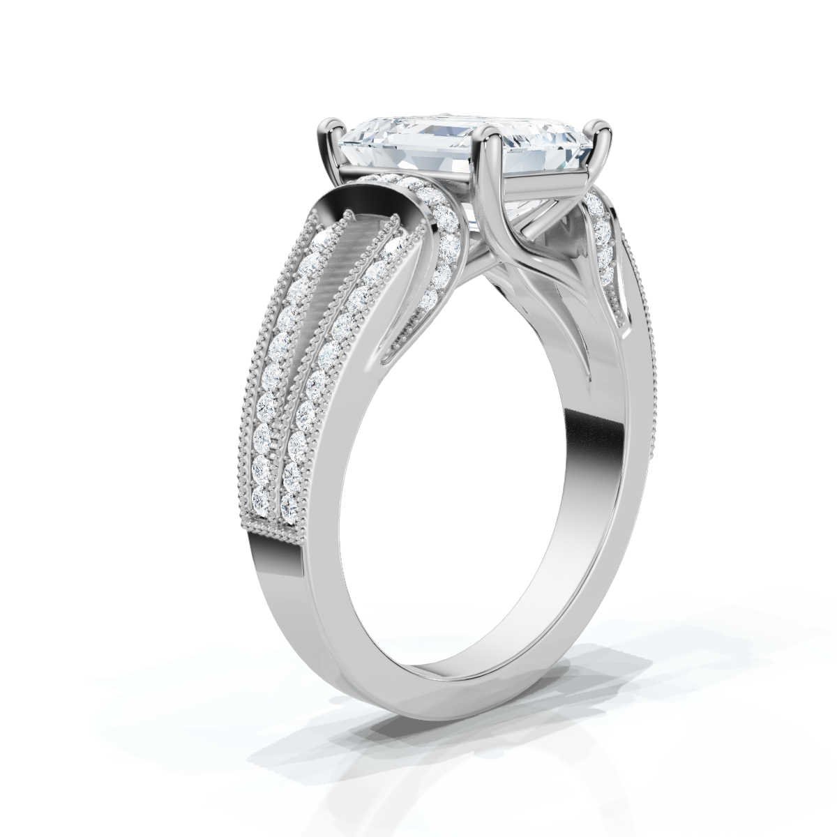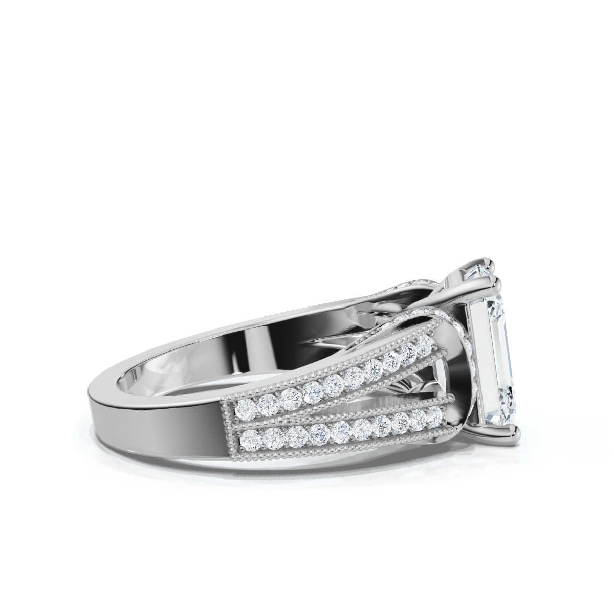 At the heart of this design lies a 2-carat emerald-cut lab-grown diamond, showcasing a flawless combination of shape and brilliance. The center stone boasts an excellent cut, with color EF and clarity VVS, ensuring a radiant sparkle that captivates from every angle. This lab diamond is IGI certified, guaranteeing exceptional quality and ethical sourcing.