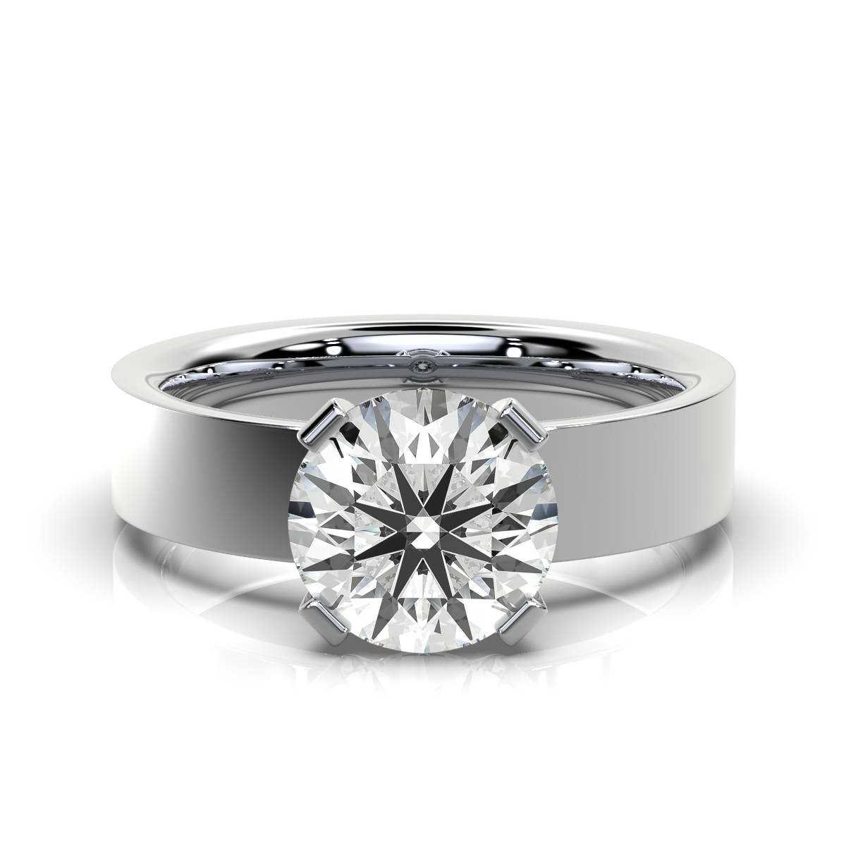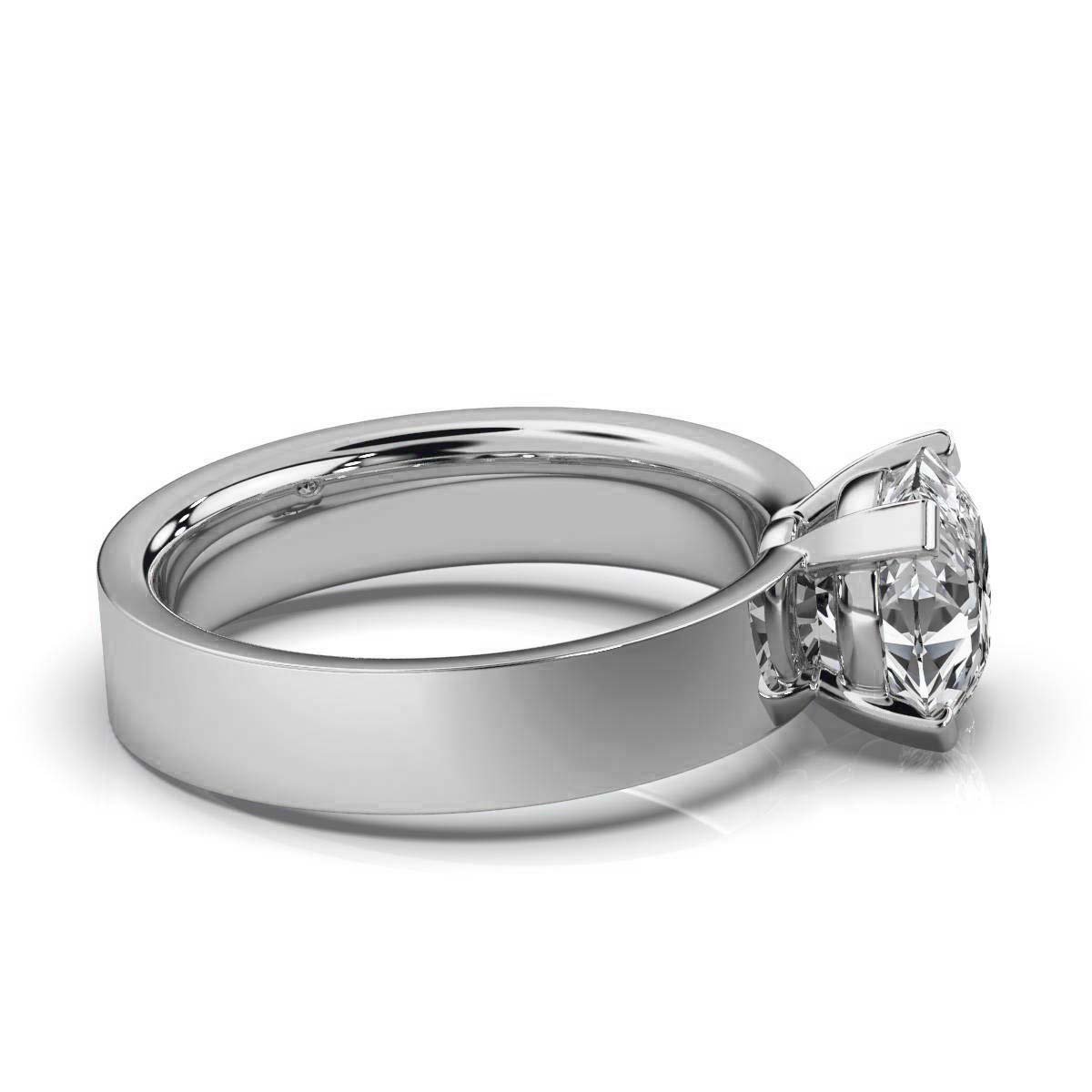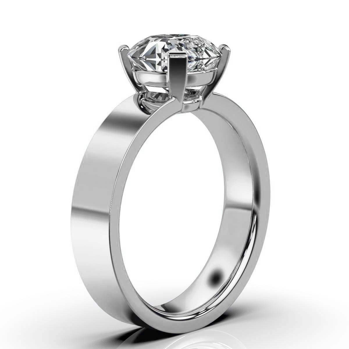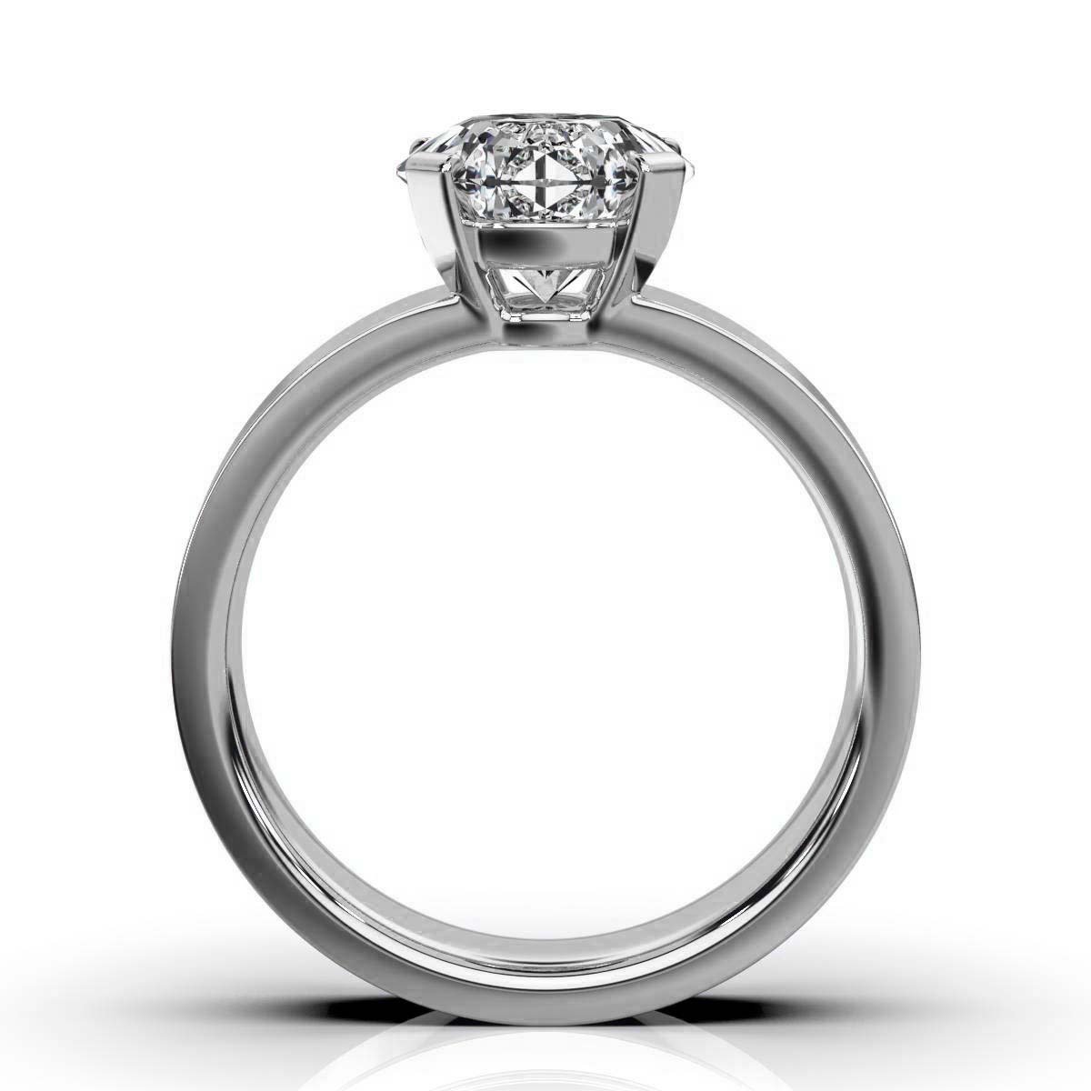 The setting showcases expert craftsmanship with a polished platinum band designed for both durability and style. The band measures 4 mm in width and 1.8 mm in height, offering a comfortable fit that allows for all-day wear without compromise. This classic solitaire setting highlights the center stone’s natural beauty without distraction, embodying simplicity and elegance.