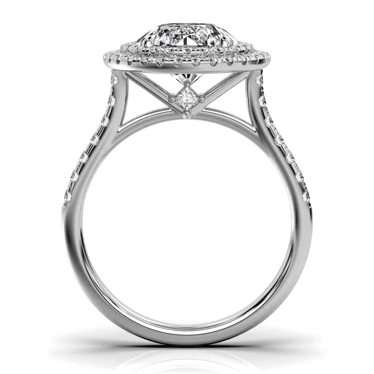 At the heart of this ring lies a 2-carat round natural diamond, showcasing a superb cut and clarity. Enhanced by two halos of round and princess-cut natural diamonds with a total weight of 0.58 carats, the arrangement creates a captivating sparkle that highlights the brilliance inherent in each stone.