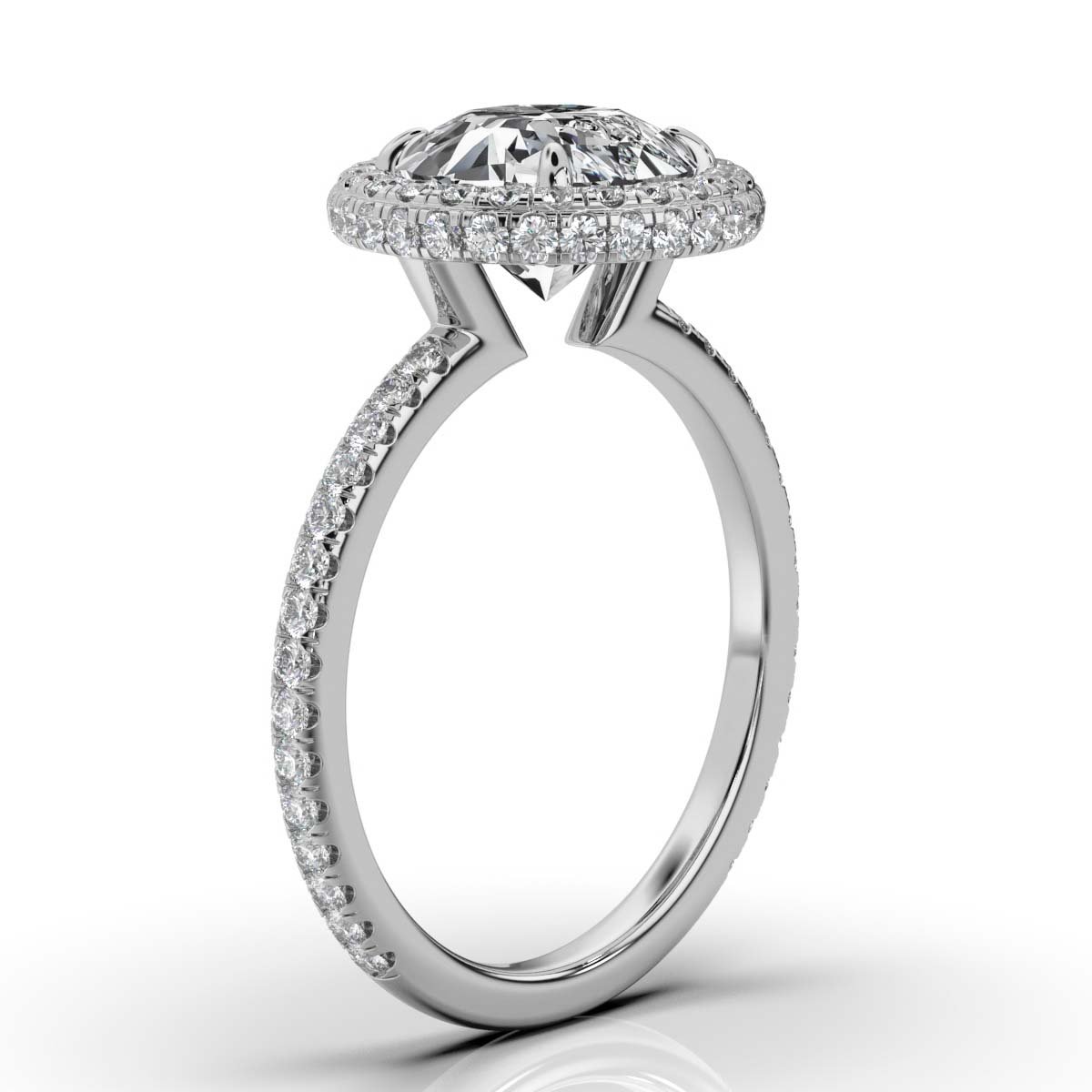 The center diamond is framed by a dazzling halo of 82 round Natural Diamonds, weighing a total of 0.62 carats. Set in a contemporary claw style, this halo arrangement maximizes sparkle while providing a secure and stylish setting. The slim 1.5 mm wide band is crafted from 950 Platinum and designed for comfortable, everyday wear with a comfort fit.