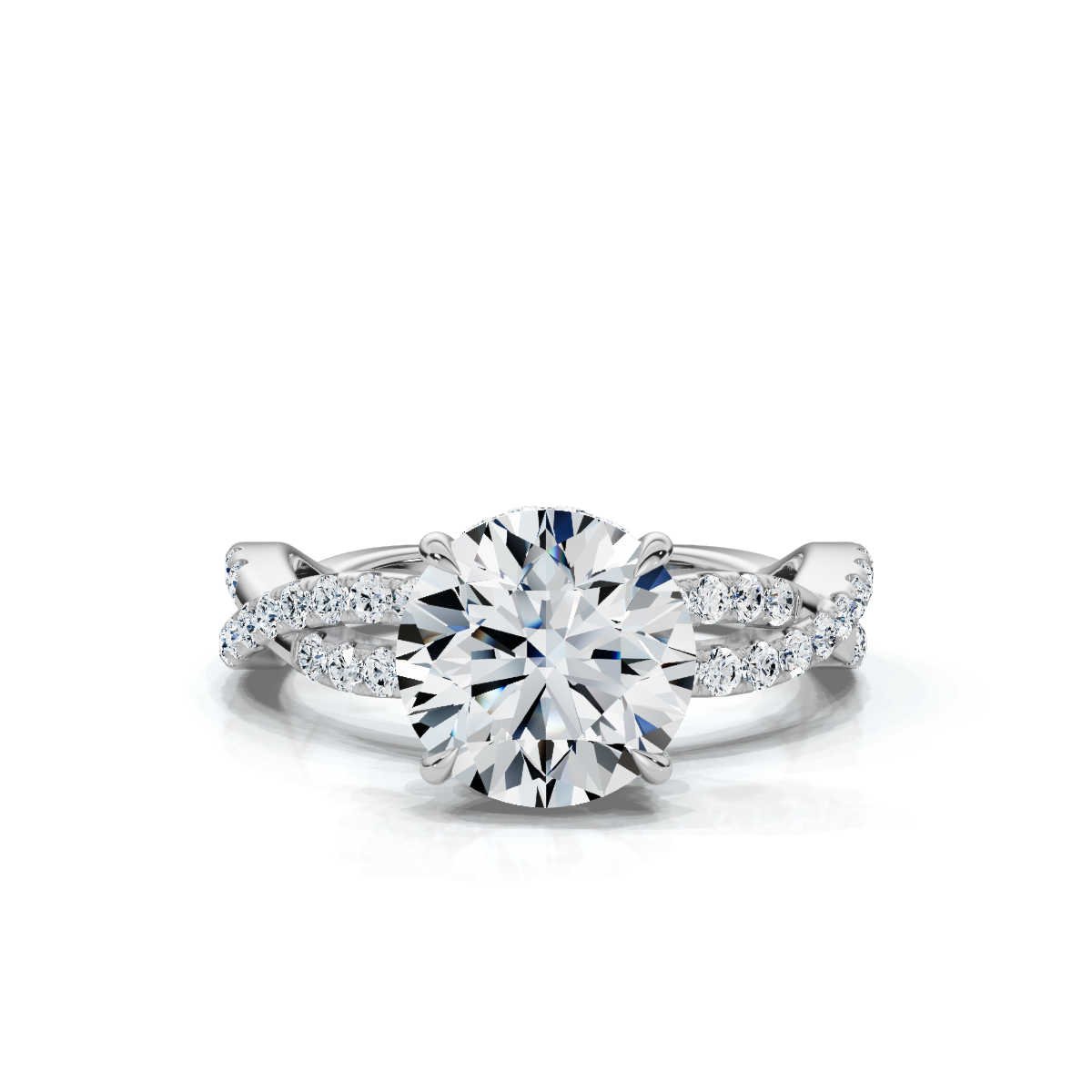 Platifine 950 Platinum 2ct Super Cut Natural Diamond Round Twist Engagement Ring with 0.54 ct side diamonds, Super Cut brilliance — GIA Certified.