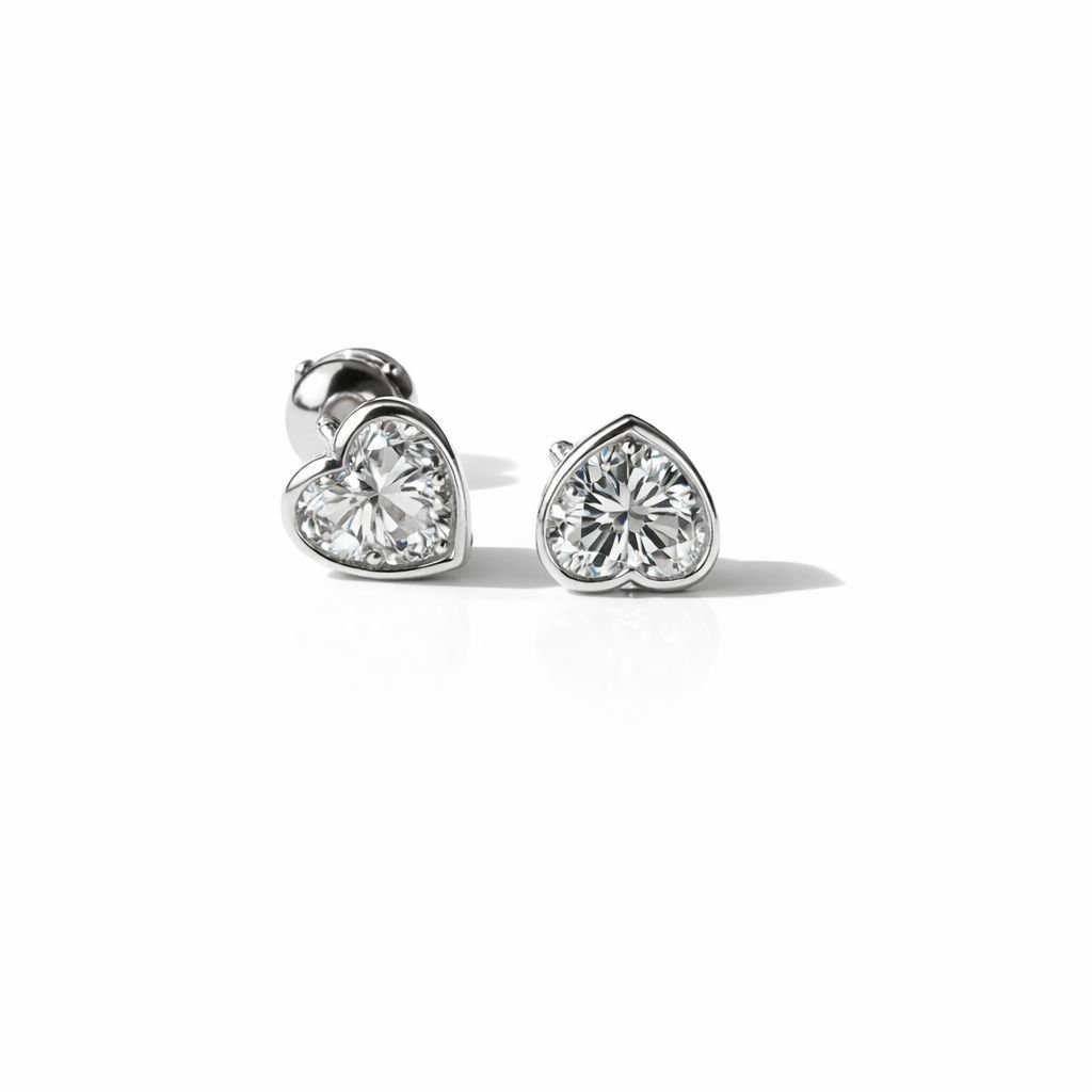 Platifine Heart Cut 1CT Lab Diamond stud earrings in 950 Platinum with classic prong setting, EF color VVS clarity, Excellent cut – IGI Certified.