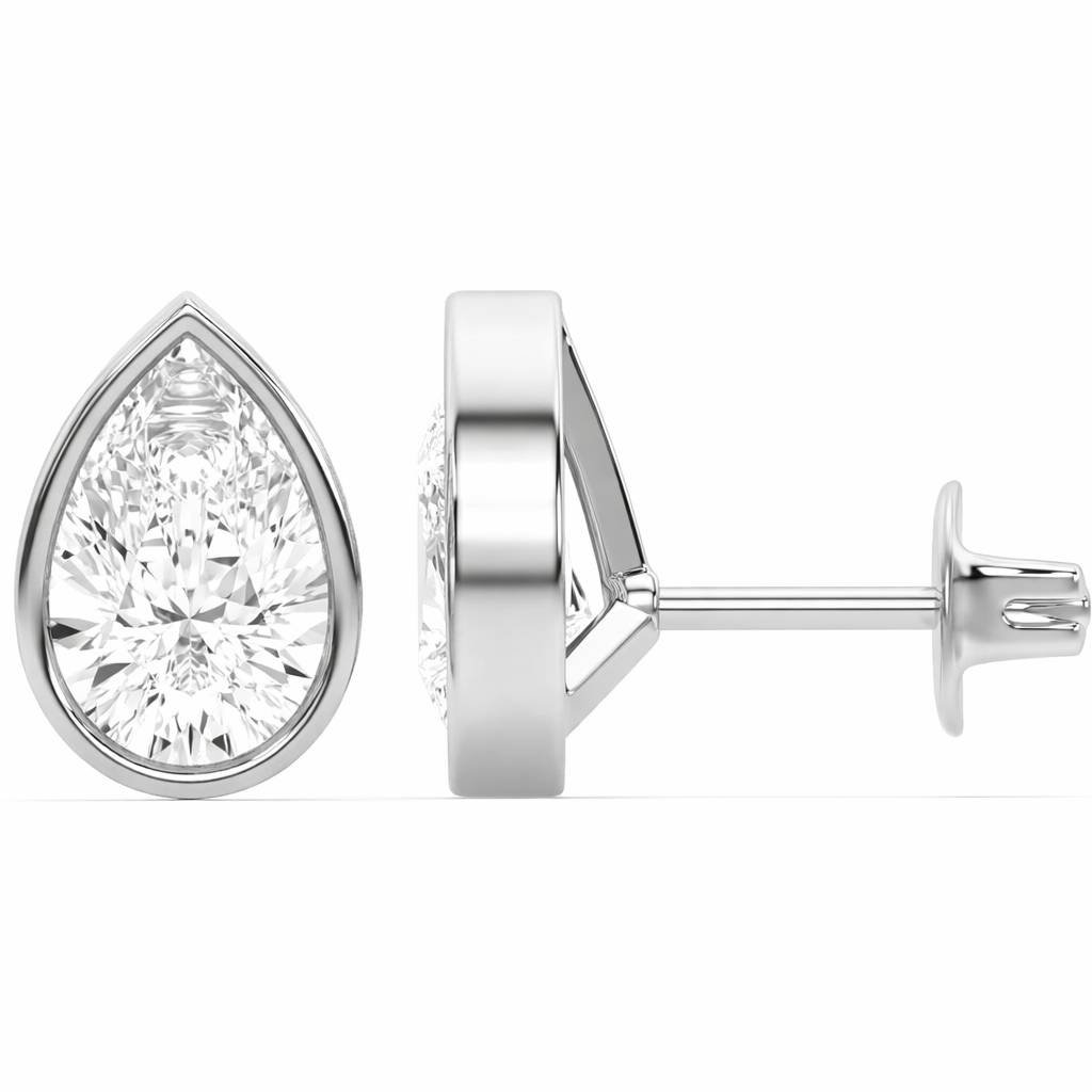 Platifine Pear Cut 3 CT Lab Diamond pair, bezel-set solitaire stud earrings in 950 Platinum. IGI Certified, excellent cut, timeless design for everyday wear.
