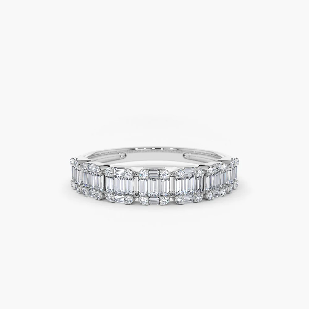 The moissanite is securely held in a classic prong setting, which complements the sleek and durable 950 Platinum band. The prong design allows maximum light to enter the stone, enhancing its scintillation while ensuring a comfortable wear. This craftsmanship reflects Platifine’s commitment to combining traditional techniques with modern sophistication in every piece.